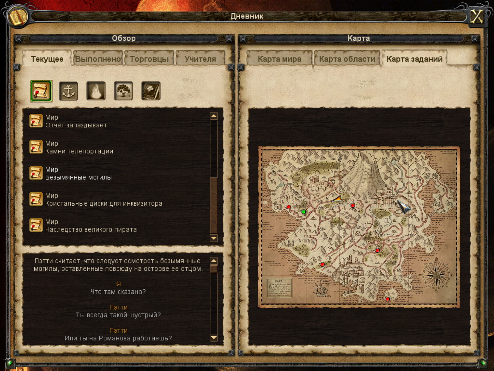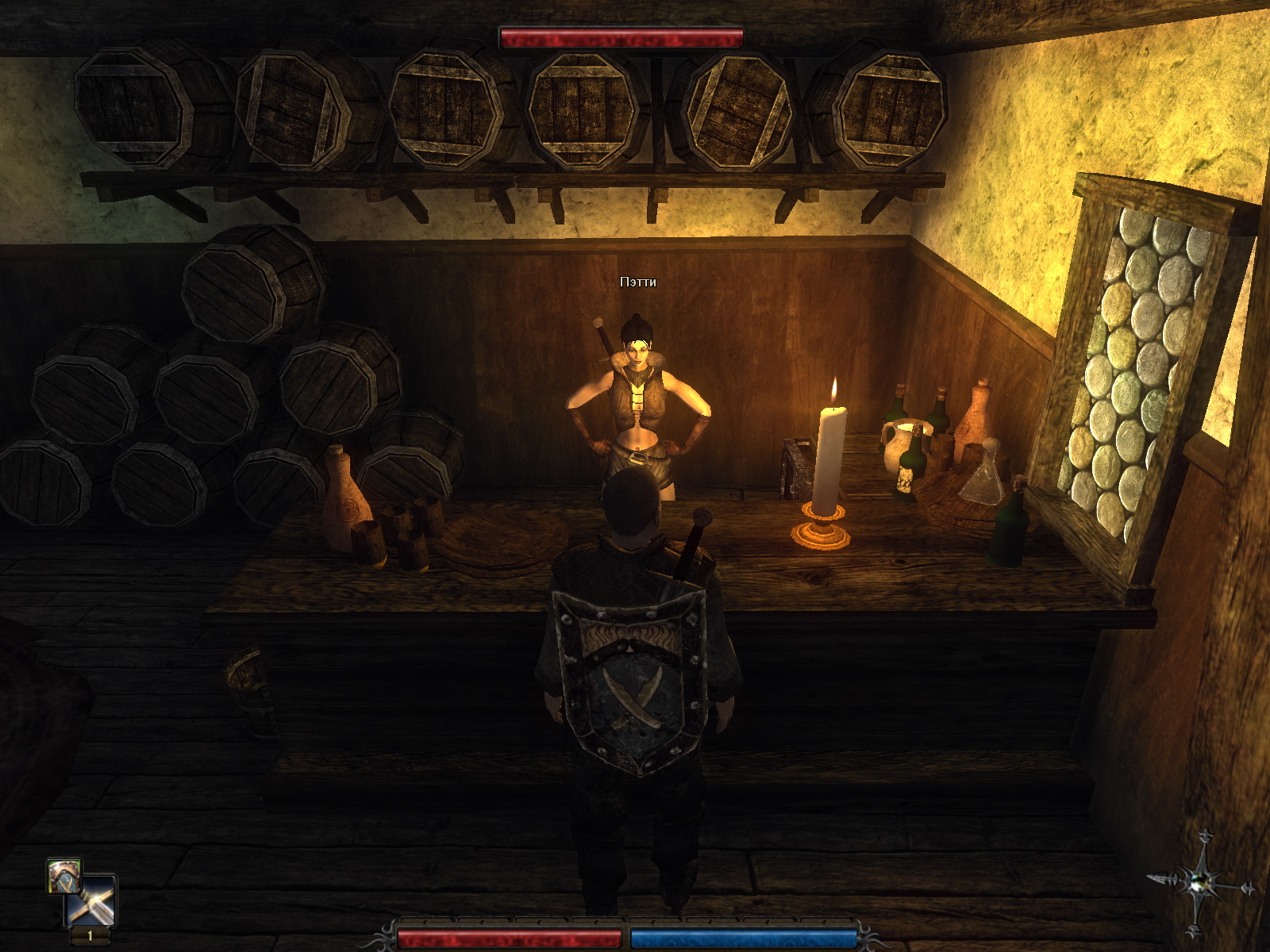 Первым делом подходим к Пэтти, она находится в таверне, у центрального склада! Она предлагает нам выпить пиво, от чего мы, кстати, не отказываемся, и начинаем разговор о её жизни! Сквозь недолгого рассказа она говорит, что хочет выйти из города и отправится на поиски своего отца-моряка, Грегориуса! Соглашаемся ей помочь и отправляемся к капитану Романову, который находится в заточении.