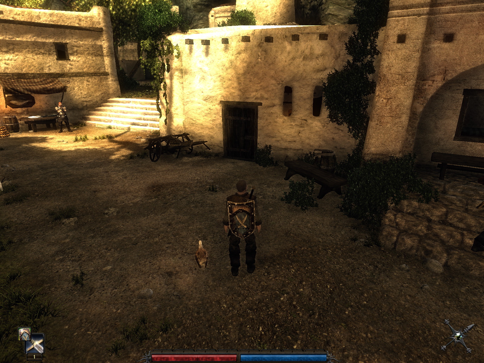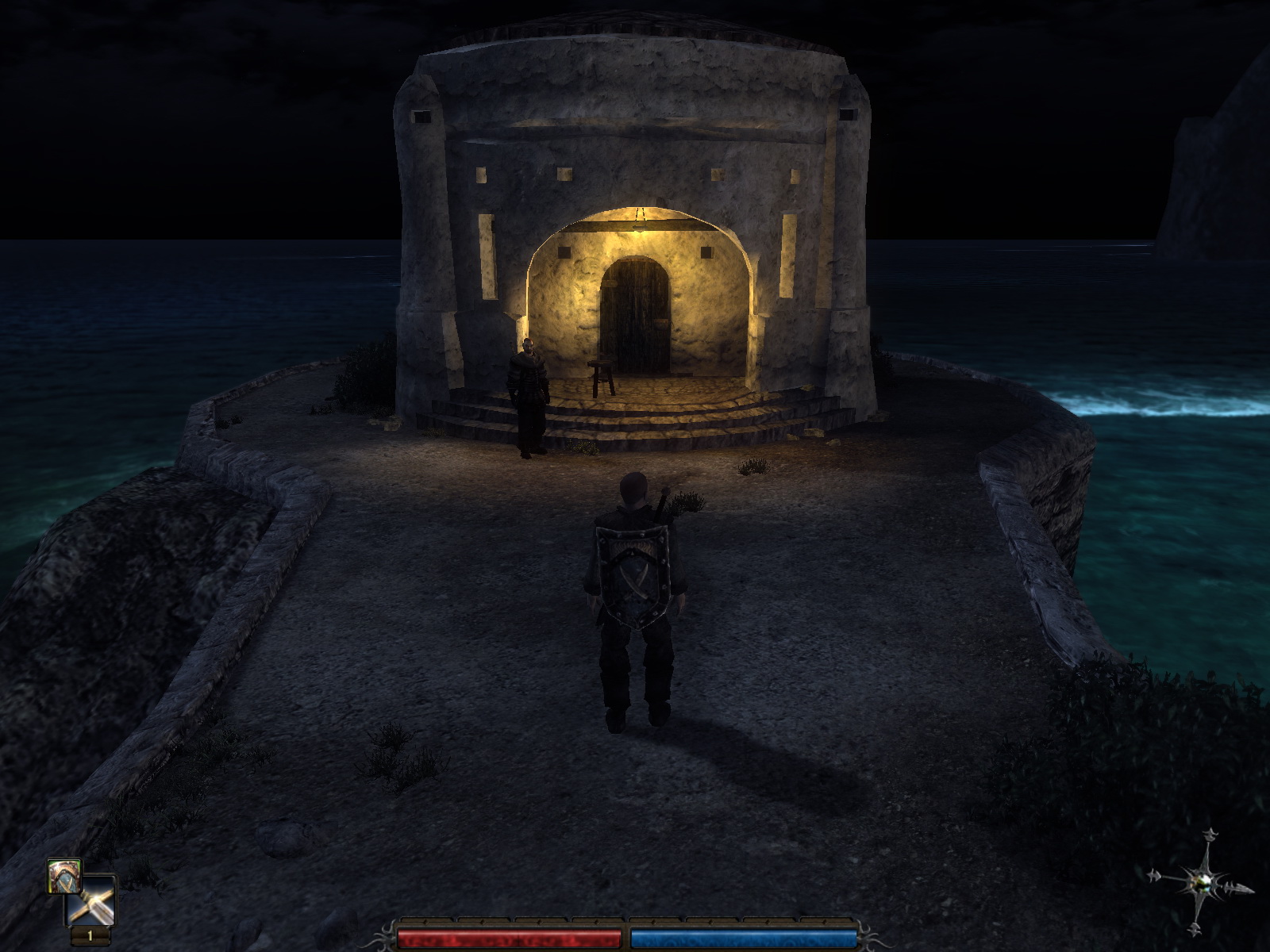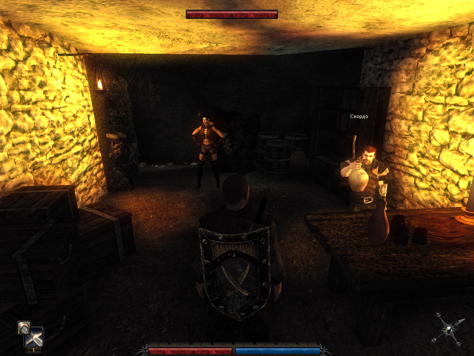 Но, увы поговорить с ним мы не можем, нам мешает охранник, разговариваем с ним и понимаем, он очень хочет женской ласки. Бежим в бордель Сони, платим ей 50 золотых монет за девушку и бежим назад, но по пути, возле склада говорим с девушкой по имени Аника, о её работе в этом деле, она уходит за камеру, бежим к охраннику и говорим что Аника составит ей компанию, он также уходит за камеру, следуем за ним и забираем у него ключ!