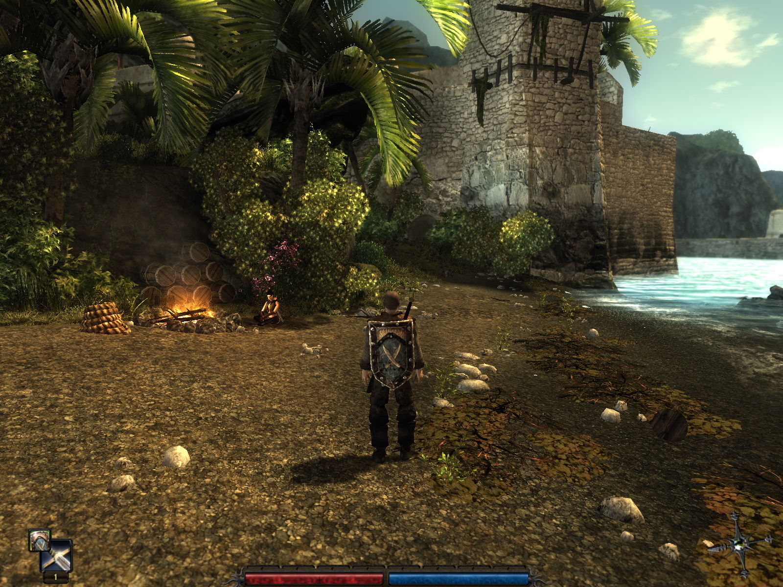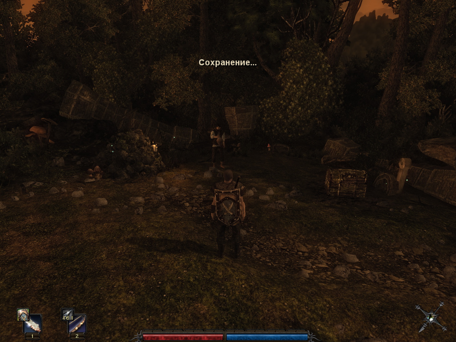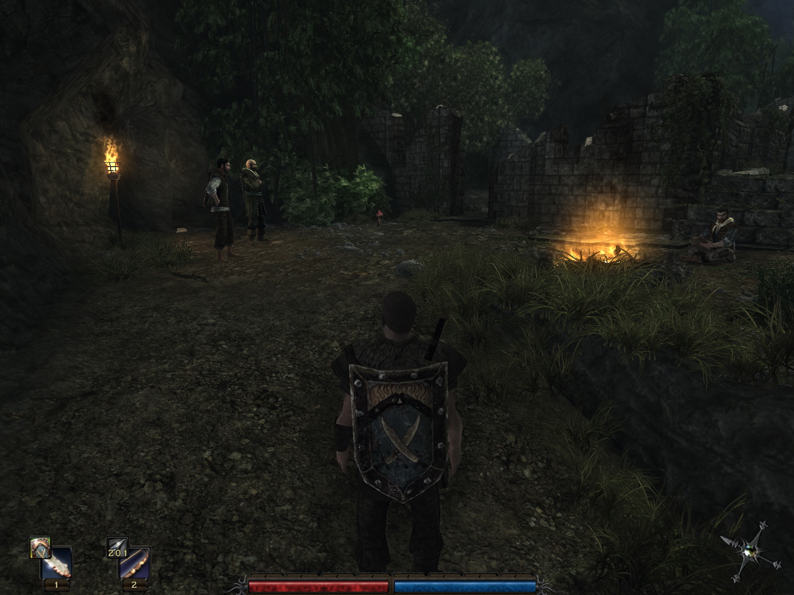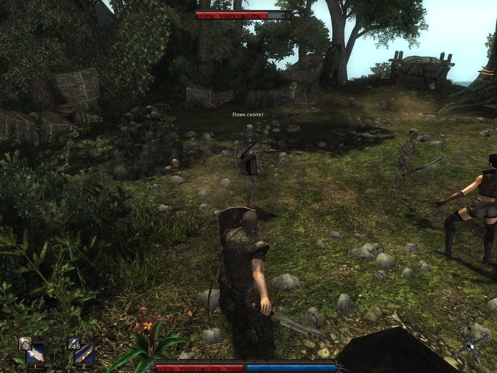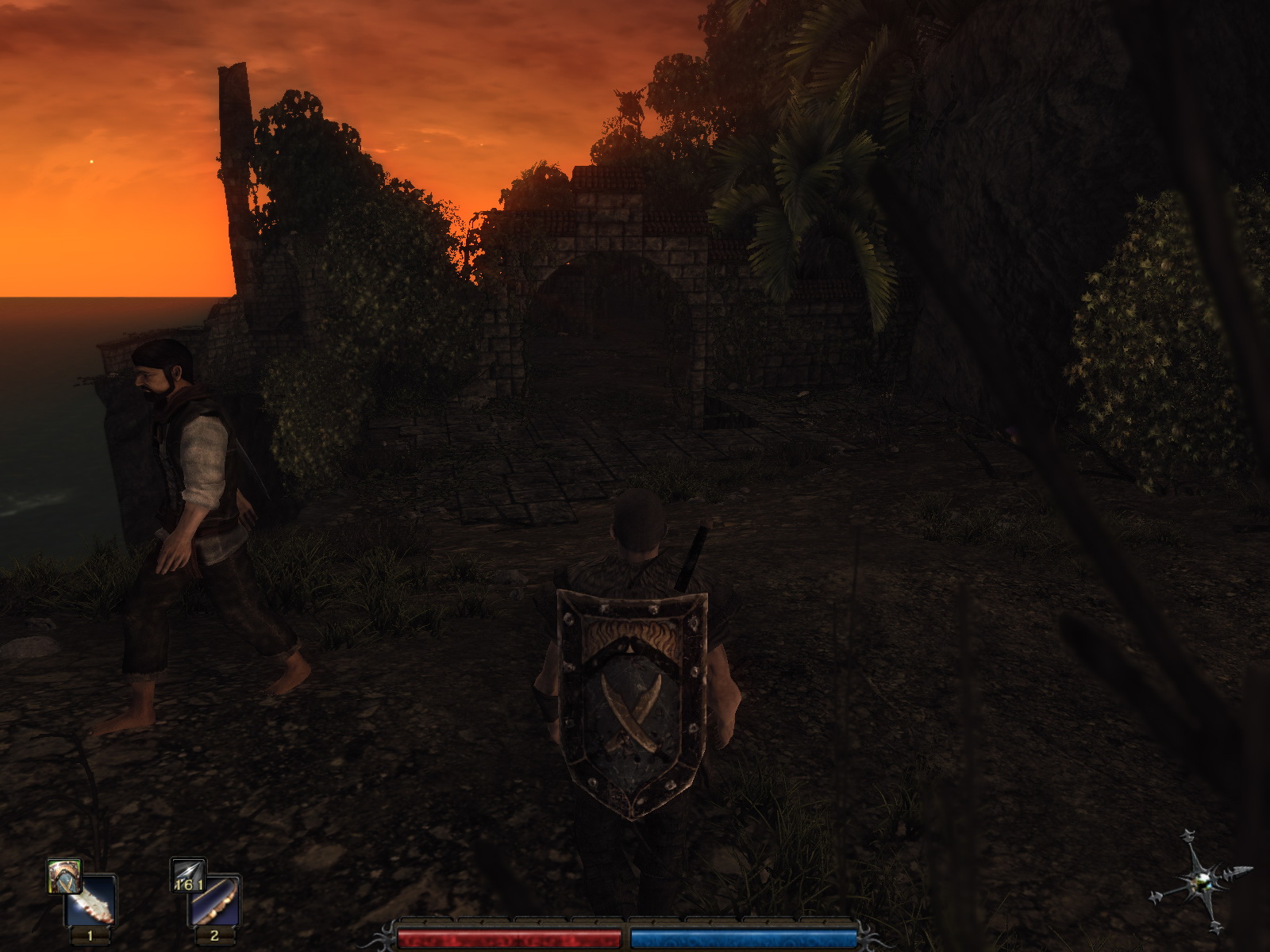 Эронг проведет нас до развалин, кишащие скелетами, так что настоятельно рекомендую закупить пару тройку целебный снадобий, и оружием по лучше. После закупок возвращаемся и идем по тропе, постепенно спускаясь ниже к набережной, пока не дойдем до следующих развалин, там рядом с ними будет стоять Романов, со своими головорезами.