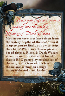 Официальный блог Risen, который ведут сами Deep Silver, работает уже давно. Периодически там появляется что-то новенькое. Ну и естественно, уже многие поклонники игры подписались на новостную ленту блога. Недавно там была обнаружена также индивидуальная страничка Risen 2, которая оформлена в оригинальном стиле. Кроме окошка трейлера и уже знакомого нам давно концепт-арта одного из монстров, на страничке Risen 2 присутствует окошко с описанием игры такого вида: