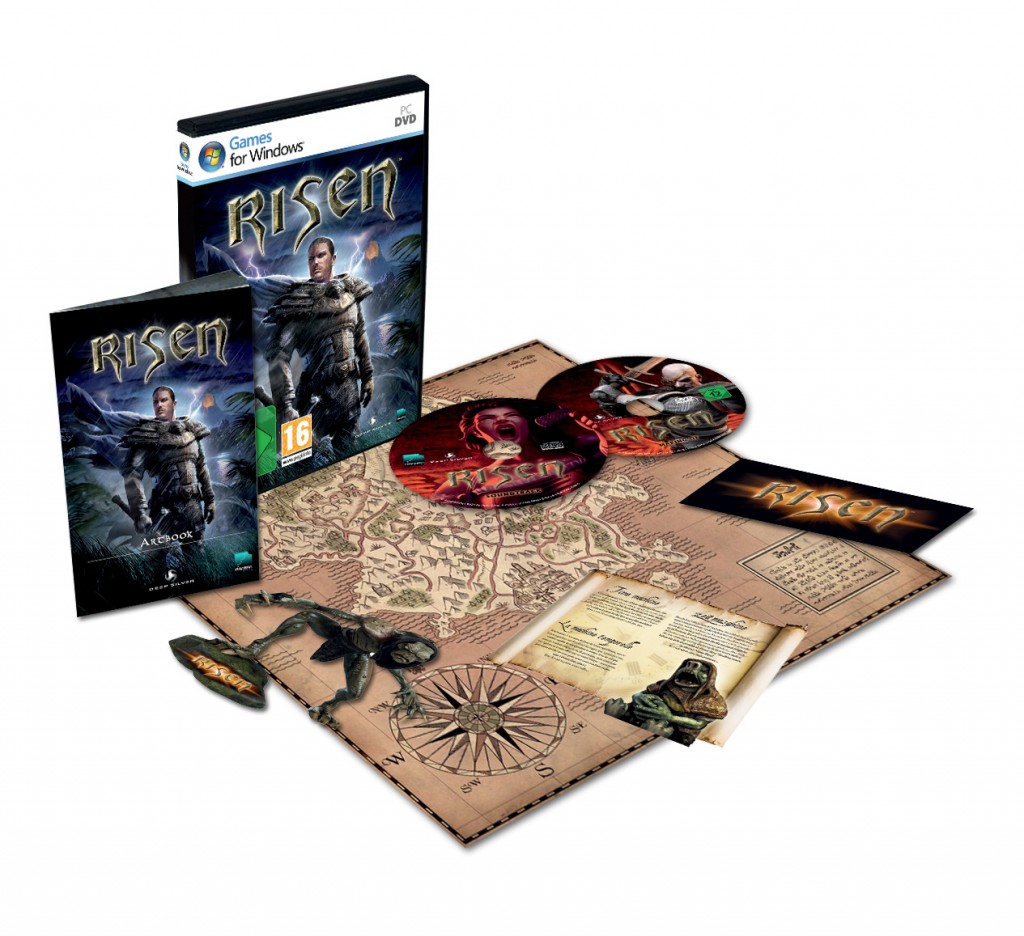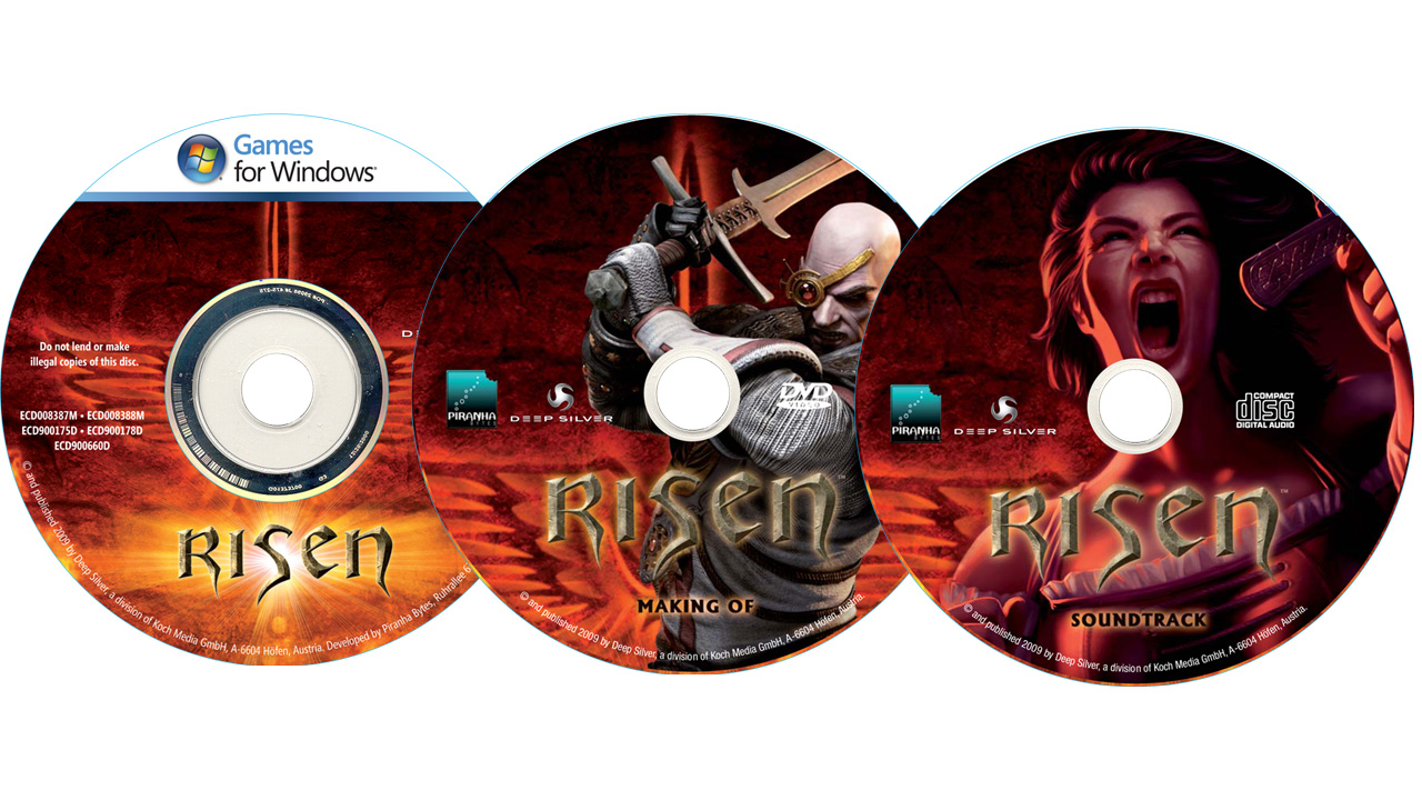 Мы уже знаем содержание коллекционной версии Risen как в Германии, так и в России, а также видели обложку. Но до сих пор нам не было известно, как же будет выглядеть сам диск с игрой и другие диски, входящие в издание. И, наконец-то, сегодня мы можем показать вам, как будут выглядеть диски, входящие в состав издания Risen в Германии: