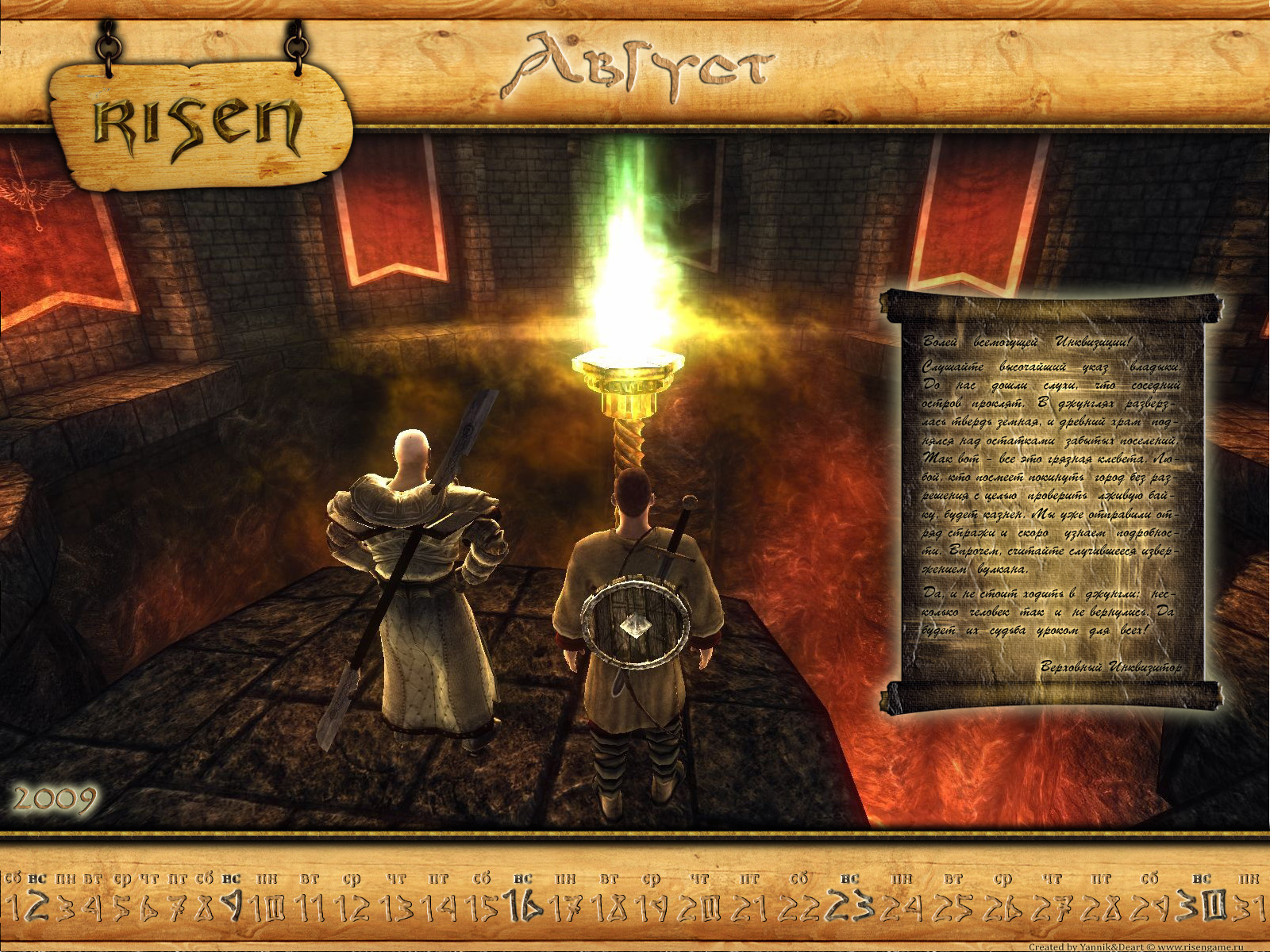 Представляем вам очередной подарок от нашего сайта - августовский календарь "Risen". В этом месяце на календаре мы видим двух главных действующих лиц игры (за исключением Дона - главаря бандитов) - Безымянного и Инквизитора Мендозу. Именно им предстоит решать судьбу острова.